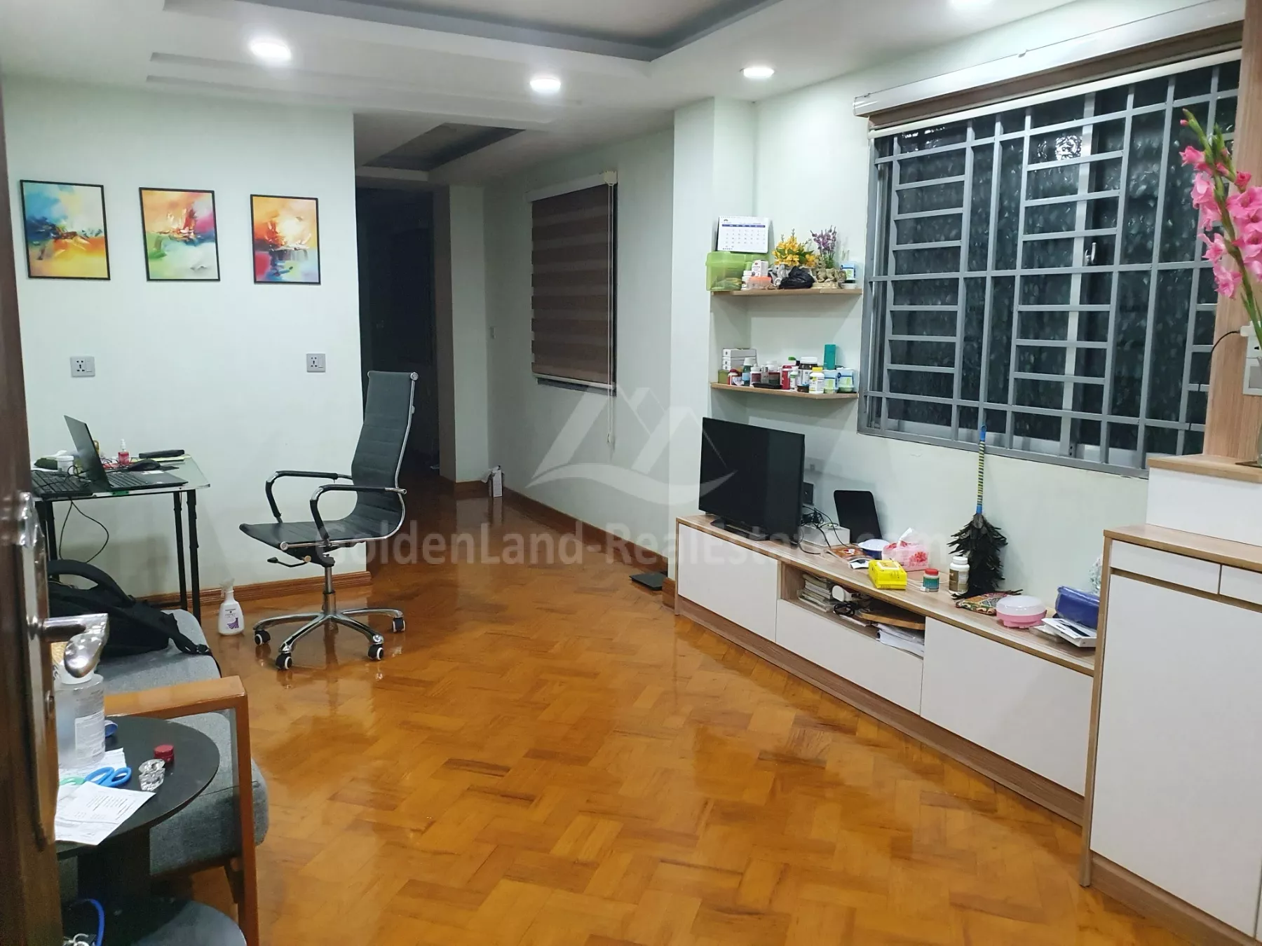 • ပြတင်းတံခါးများ အတွင်းဘက် သံပန်းတပ်ဆင်ထားပြီး